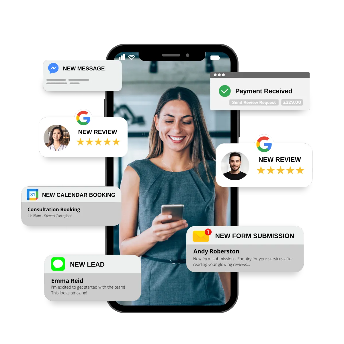 Reach your customers wherever they are with text messaging. Request reviews, connect with website visitors, collect payments, respond to Facebook & Google Messages, and market to customers and leads all from your app.